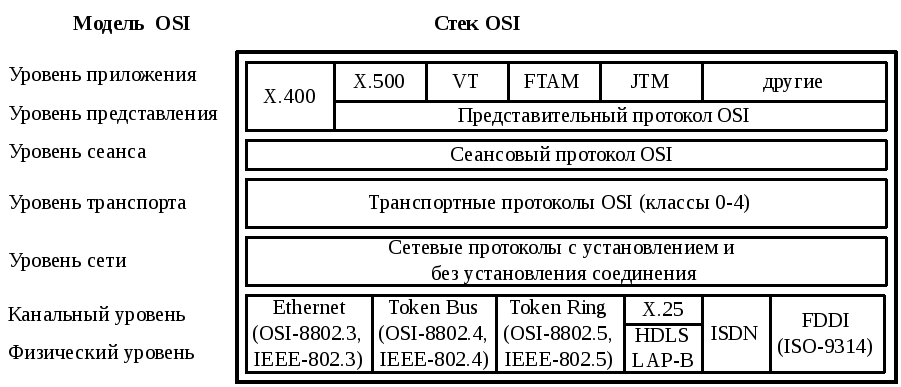 На физическом и канальном уровняхстек OSI поддерживает спецификацииEthernet,TokenRing, FDDI, а также протоколы LLC, X.25 и ISDN.