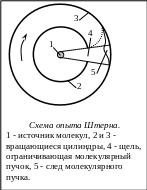 Одними из самых знаменитых опытов с молекулярными пучками были эксперименты Штерна, в которых впервые удалось осуществить прямые измерения молекулярных скоростей. Наиболее известная схема опыта Штерна показана на рис. ниже. Платиновая нить 1, на которую была нанесена капля серебра, находилась на оси двух коаксиальных цилиндров 2 и 3, причём в цилиндре 2 имелась щель, параллельная его оси. Цилиндры могли вращаться вокруг своей оси. В опытах Штерна угловая скорость их вращения составляла 2...3 тысячи оборотов в минуту.