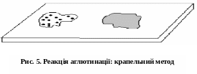 При позитивній реакції у краплі з аглютинуючою сироваткою з’являються пластівці, крупинки. Рідина стає прозорою. У контрольній краплі рідина залишається каламутною, а пластівці і крупинки не утворюються. Реакція краще роздивляється на темному фоні (рис. 5).