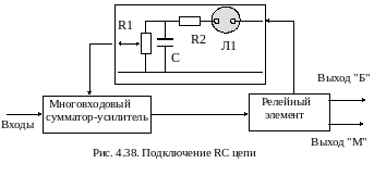 На практике в регуляторах фактически используются два звена обратной связи. Одно звено работает при включении трехпозиционного элемента, другое - при отключении. Для этой цели в некоторых промышленных регуляторах используется подключение RC цепи через неоновую лампочку как показано на рис. 4.38. Поскольку выходной сигнал релейного элемента имеет величину большую напряжения зажигания неоновой лампы заряд конденсатора идет через сопротивление R2, а разряд - через сопротивление R1.