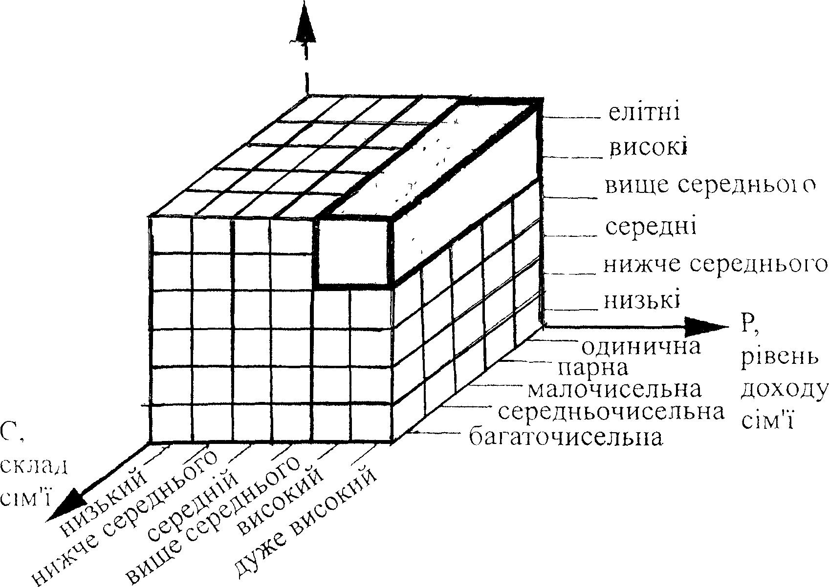 В результате сегментации целевого рынка по перечисленным переменным он разбит на 180 сегментов. Графическая интерпретация процесса сегментации рынка, выполненного по описанной выше методике, показано на рис. 1. На нем большой куб символизирует целевой рынок, а отдельные маленькие - целевые сегменты. Состояние каждого из них определяется конкретными количественными значениями трех переменных, которые называются параметрами сегмента. Возникает необходимость решения таких вопросов :