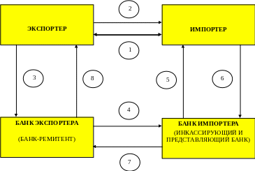 Банк, получающий инкассовое поручение от своего клиента-экспортера, называется банком-ремитентом. Банк-ремитент направляет инкассированные документы в инкассирующий банк страны импортера, который обычно одновременно является и представляющим банком (т.е. он уведомляет плательщика-импортера об имеющихся в банке неоплаченных или неакцептованных документах и выдает документы плательщику).