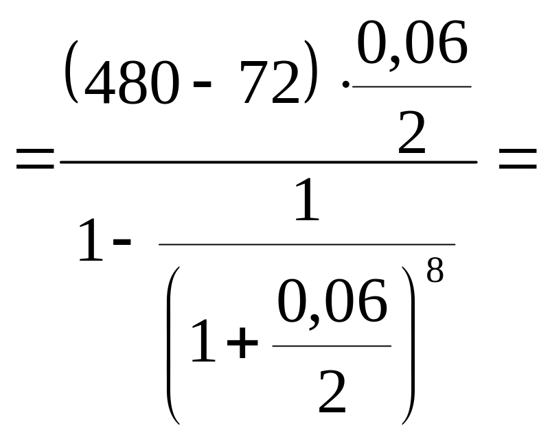 Пример. Первоначальная стоимость лизингового имущества (Сп.л) составляет 480 тыс. дол. Срок лизинга (Тл) равен 4 года. Процентная ставка с учетом комиссионных (Ст(Пр)) составляет 6,0 % (0,06) годовых от первоначальной стоимости лизингового имущества. Выплата платежей по лизингу производится два раза в год. Определить размер каждого платежа и общую сумму лизинговых платежей, если договором предусмотрены равные по размерам платежи на протяжении срока лизинга.