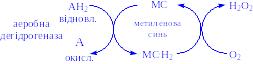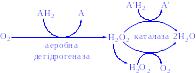 2) Аеробні дегідрогенази – ферменти, які каталізують видалення водню із субстрату; на відміну від оксидаз вони як акцептор водню можуть використовувати не тільки кисень, а і штучні акцептори, такі, як метиленовий синій. Ці дегідрогенази відносяться до флавопротеїнів, і продуктом реакції, яку вони каталізують є пероксид водню, а не вода: