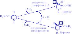 Відновлення нікотинаміду субстратом (АН2) по положенню 4 відбувається стереоспецифічно. Один з атомів водню переноситься від субстрату в положення 4 у виді ядра водню з двома електронами (гідрид-іон, Н- ): він може приєднатися або в А-, або у В-положенні в залежності від специфічності дегідрогенази, яка каталізує дану реакції. Інший водень, який відщеплюється від субстрату, залишається вільним у виді іона водню.