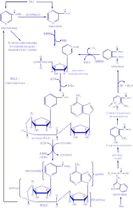 Рис 1. Синтез і розклад нікотинамідаденіндинуклеотиду (НАД).