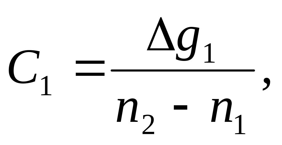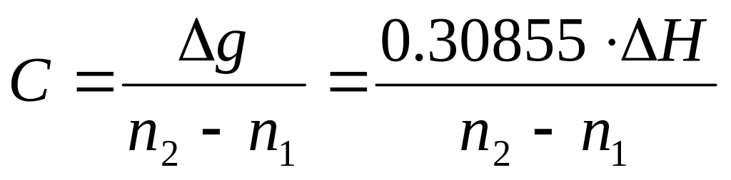 Во-первых, можно использовать метод повысотной съемки. Как это следует из формулы (6.7), величина нормального вертикального градиента силы тяжести составляет 0,30855 мГл /м. Поэтому, если взять отсчеты n1 и n2 по гравиметру в двух пунктах, разность высот между которыми составляет ΔН (м), можно определить приращение ускорения силы тяжести между этими пунктами, как Δg (мГл) = 0,30855 ΔН.(м) Тогда цену деления гравиметра можно определить по формуле: