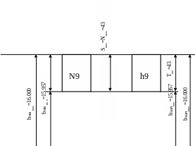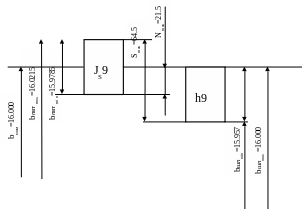 предельные размеры: b1max=16,000 мм; b1min=15,957 мм;