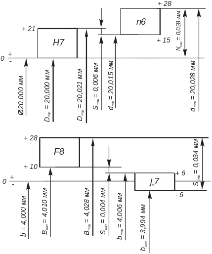 Nmax = dmax – Dmin = 20,028 – 20,000 = 0,028 мм.