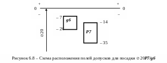Посадка зубчатого колеса на вал 20P7/g6 обусловлена необходимостью сохранения одного поля допуска на всей правой части вала и в значительной мере определяется уже выбранной посадкой вала в подшипниковую втулку (20 Н7/g6), запрессованную в крышку. В результате она не относится к посадкам ни в системе основного отверстия, ни в системе основного вала, а поэтому и не является рекомендуемой посадкой, хотя образована с использованием предпочтительных полей допусков отверстия и вала. Поле допуска отверстия Р7 ниже нулевой линии (верхнее отклонение – 0,014 мм, нижнее отклонение – 0,035 мм) и вала также ниже нулевой линии (верхнее отклонение – 0, 007 мм, нижнее отклонение – 0, 020 мм). Поля допусков частично перекрывают друг друга, в результате образуется переходная посадка. Для более наглядной оценки посадки полезно построить схему расположения полей допусков (рисунок 6.8).