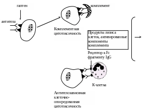 Помимо комплементзависимых, существуют цитотоксические реакции без участия комплемента. Лизис клетки, покрытой антителами, могут вызывать любые лейкоциты, которые несут соответствующий Fc-рецептор, связывающийся с Fc-фрагментом антитела. Нередко они фагоцитируют обломки ядер, в результате образуются «волчаночные клетки», имеющие фагоцитированные и адгезированные к их поверхности фрагменты ядер (встречаются при системной красной волчанке – СКВ).