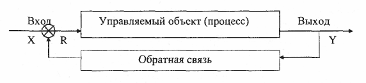 Входная величина R воздействует на управляемый объект (процесс) и превращается в выходную величину Y. Величина Y с помощью канала обратной связи подается на вход, регулирует входную величину R и в виде управляющего сигнала X воздействует уже по-новому на управляемый объект (процесс).