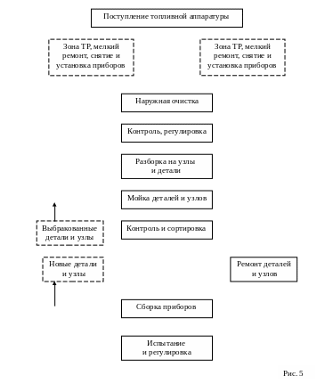 Типовая последовательность выполнения работ по ремонту топливной аппаратуры выглядит следующим образом (см. рис. 5): приборы, узлы и агрегаты системы питания, поступившие на участок, очищают от грязи, после чего направляют на рабочие места, где их проверяют и ремонтируют.