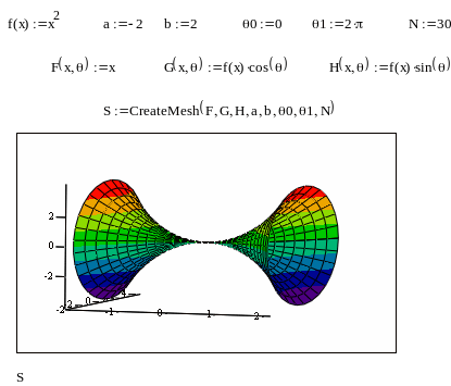 Если вращать такую линию вокруг оси OX, то получим некоторую фигуру, поверхность которой называют поверхностью вращения. В ранних версиях MathCAD (например, MathCAD 7) для построения графика поверхности вращения необходимо было перейти к заданию функции в параметрической форме. В MathCAD 2001 для построения графика поверхности вращения может быть использована функция CreateSpace в виде