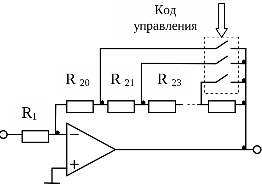 В предыдущем варианте регулятора усиления изменением глубины отрицательной обратной связи регулировка осуществлялась плавно. На рисунке 6.8 приведена функциональная схема операционного усилителя, в котором регулировка осуществляется дискретно путем коммутации резисторов, включенных в цепь обратной связи. Управление электронными ключами осуществляется двоичной кодовой комбинацией, поступающей от микропроцессорной системы управления радиоприемником.