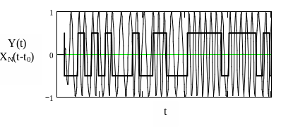 После повышающего преобразователя частоты получается сигнал MSK, временная диаграмма которого приведена на рисунке 8.23. На этом же рисунке показана последовательность элементарных посылок на входе формирователя, задержанная на временной интервал t0.