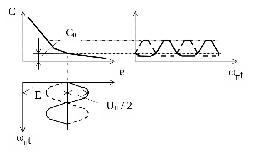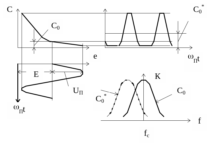 При отсутствии помехи емкость варикапа определяется напряжением постоянного смещения Е и равна С0. При этой емкости контур настроен на резонансную частоту, равную частоте принимаемого сигнала fc. При появлении сильной синусоидальной помехи с амплитудой Uп емкость варикапа изменяется во времени с частотой помехи, постоянная составляющая этой емкости С0* >C0, резонансная характеристика контура смещается в облать более низких частот, контур оказывается расстроенным относительно частоты принимаемого сигнала. При изменении амплитуды помехи коэффициент передачи входной цепи для сигнала будет изменяться, что приводит к перекрестной модуляции. Ослабить влияние помехи можно, используя встречно-последовательное включение варикапов, как это показано на рисунке 2.6.