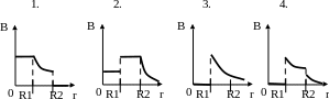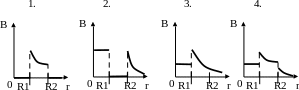 9.6. По двум бесконечно длинным коаксиальным (с общей осью) цилиндрическим поверхностям радиусами R1 и R2 текут токи силой I1 и I2, причем I2=2I1. Используя теорему о циркуляции вектора , выведите формулу зависимости модуля В от расстояния r от оси цилиндра и постройте график этой зависимости. Какой цифрой обозначен этот график на рисунке?