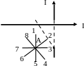 8.3. В каком направлении в точке А может быть направлен вектор индукции магнитного поля, созданного двумя прямыми взаимно перпендикулярными бесконечно длинными проводниками, по которым текут одинаковые токи (см. рисунок)? Укажите номер этого направления. Все направления 1-8 располагаются в плоскости чертежа. Если вектор не располагается в этой плоскости, запишите в ответа цифру 9.