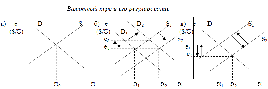 Спрос на национальную валюту (фунт) определяется: 1) спросом других стран на товары, произведенные в данной стране (в Великобритании) и 2) спросом других стран на финансовые активы (акции и облигации) данной страны (Великобритании), поскольку для того, чтобы оплатить эту покупку товаров и финансовых активов, иностранные государства (например, США) должны обменять свою валюту (доллар) на валюту страны, у которой они покупают (фунт). Поэтому спрос на национальную денежную единицу (фунт) будет тем выше, чем больше желание иностранцев (например, американцев) купить товары, произведенные в данной стране (Великобритании) (т.е. чем больше экспорт английских товаров) и приобрести ее финансовые активы (экспорт (?) капитала). Рост спроса на валюту (сдвиг вправо кривой спроса на фунты от D1 до D2 на рис.20.1.(б)) ведет к росту ее «цены», т.е. валютного курса (от е1 до е2). Рост валютного курса означает, что иностранцы (американцы) должны обменивать (платить) больше единиц своей валюты (долларов) за единицу валюты данной страны (фунт). Если первоначально мы предположили, что валютный курс фунта равен 2 доллара за 1 фунт, то его рост означает, что соотношение валют стало, например, 2.5 доллара за 1 фунт. Предложение национальной валюты (фунта) определяется: 1) спросом данной страны (Великобритании) на товары, произведенные в других странах (США), т.е. на импортные товары, 2) спросом данной страны на финансовые активы других стран, поскольку для того, чтобы оплатить покупку данной страной (Великобританией) товаров и финансовых активов других стран (США), она должна обменять свою национальную валюту (фунты) на национальную валюту той страны, у которой она покупает (т.е. на доллары). Предложение национальной валюты (фунтов) будет тем больше, чем больше желание данной страны (Великобритании) купить товары и финансовые активы других стран (США). Рост предложения национальной валюты (фунтов) (сдвиг вправо кривой предложения фунтов от S1 до S2 на рис.20.1.(в)) снижает ее валютный курс (от е1 до е2). Снижение валютного курса, т.е. цены национальной денежной единицы означает, что за 1 единицу национальной валюты (фунт) можно в обмен получить меньшее количество иностранной валюты (долларов), например, не 2 доллара за 1 фунт, а только 1.5 доллара за 1 фунт.