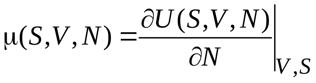 Химический потенциал равен изменению внутренней энергии при добавлении частицы, если система имеет постоянный объем (V = 0) и не обменивается теплом (S = 0).