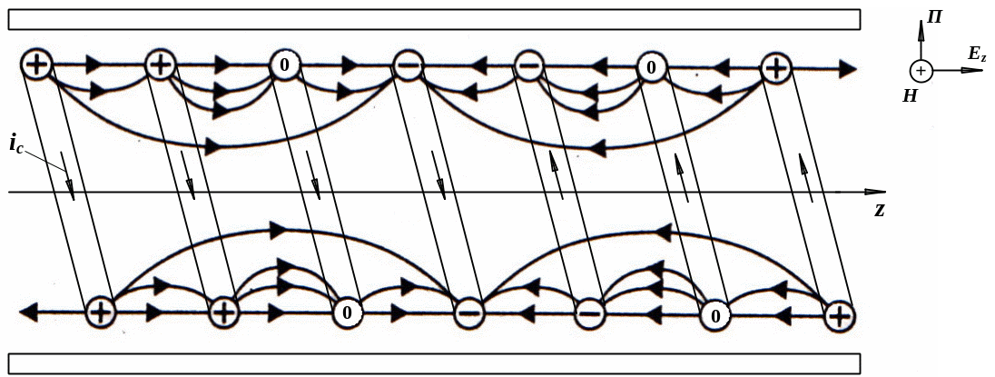 На рис. 1.8,а показана картина электрического поля внутри спирали в некоторый конкретный момент времени. Сама спираль показана в разрезе. Знаками «+» и «–» показан знак потенциала. Направление тока в витке спирали iс протекает от более высокого потенциала. Вдоль оси z (в пространстве) и во времени потенциалы изменяются по гармоническому закону. Силовые линии электрического поля начинаются на витках с более высоким потенциалом, заканчиваются на витках с более низким потенциалом.