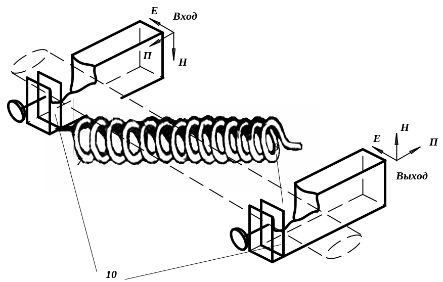 Если внутренний провод коаксиального волновода сделать спиральным, то приближенно можно считать, что электромагнитная волна распространяется со скоростью света вдоль провода спирали, то есть провод спирали является направляющей для электромагнитной волны. При этом внутри спирали образуются результирующее электромагнитное поле, имеющее продольную (по оси z) электрическую составляющую Ez, распространяющуюся вдоль оси z со скоростью vz < c. Действительно, если l – длина проводника спирали, а lz – длина спирали, то время распространения электромагнитной волны от входа до выхода спирали, с одной стороны равно