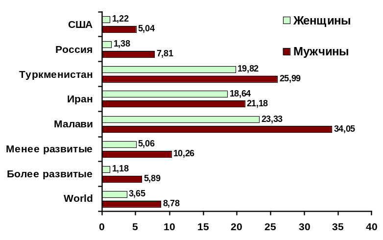 Рис. 37. Смертность (%) от рака пищевода у мужчин и женщин в различных странах.