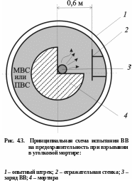 Порядок испытаний. В канале мортиры формируют заряд ВВ заданной массы. Мортиру на тележке подкатывают к днищу штрека, перекрывая отверстие в нём. Таким образом канал, а следовательно, и заряд сообщаются со взрывной камерой. В камере создают МВС или ПВС и производят взрывание. При получении “воспламенения” заряд уменьшают, а “невоспламенения” – увеличивают и повторяют опыт. Изменяя заряд по методу артиллерийской пристрелки (делением отклонения пополам), добиваются “невоспламенения” при максимально возможном заряде, который подтверждают двадцатью или пятью последовательными взрываниями (устанавливают mпр) или же методом “вверх-вниз” определяют m(50), т. е. массу заряда, дающего 50% воспламенений.