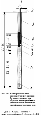 Обычно скважинные заряды взрывают детонирующим шнуром, реже – электродетонаторами. Первый способ значительно дороже (в 5…20 раз) второго, но имеет ряд преимуществ при массовых взрывах большого количества скважин: проще монтаж взрывной сети и большая ее надежность, а также безопаснее в случае отказа заряда. Для надежности взрывную сеть дублируют: концы двойной линии ДШ опускают до дна скважины, затем засыпают ВВ. Детонация будет распространяться по радиальным направлениям от детонирующего шнура. Если ВВ недостаточно чувствительно (гранулированные ВВ) и от ДШ не взрывается, то на дне скважины помещают промежуточный детонатор – насыпают слой ВВ толщиной 0,2…0,6 м (5…20 кг), хорошо детонирующего от ДШ (например, порошкообразный тротил, аммонит 6ЖВ).