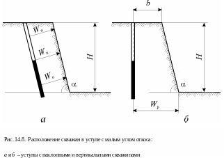 Если в уступах с малым углом откоса применяют вертикальные скважины (рис. 14.8, б), то величину ЛНС определяют по формуле