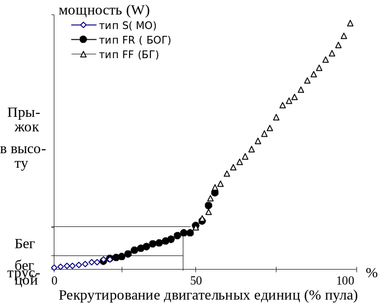 На рис. представлена предположительная модель рекрутирования двигательных единиц обусловленного потребностями в мощности данного задания. Рекрутирование начинается слева (при 0 % пула) и продолжается до тех пор, пока не будет реккрутировано достаточное количество единиц для производства мощности, необходимой чтобы выполнить задание. Например, для производства достаточного количества мощности, чтобы выполнить бег, необходимо рекрутировать около 48% двигательных единиц пула.
