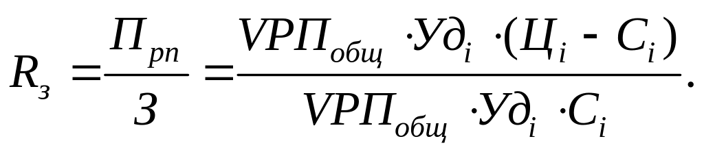 Рентабельность производственной деятельности (окупаемость издержек) рассчитывается путем отношения прибыли от реализации продукции, работ, услуг (Прп) к сумме затрат по реализованной продукции (З). Этот показатель рассчитывается в целом по предприятию и зависит от трех основных факторов первого порядка: изменения структуры реализованной продукции (Удi), себестоимости (Сi) и уровня среднереализационных цен (Цi):