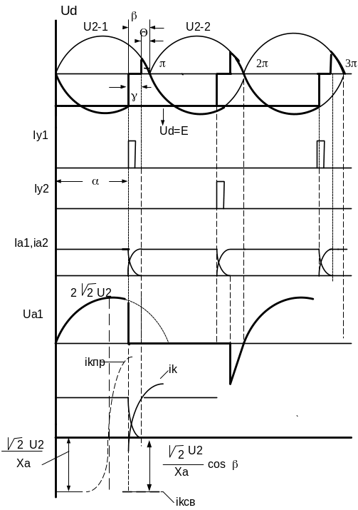 По окончании интервала α, т.е. с опережением на угол β относительно точки π, подачей управляющего напряжения отпирается тиристор 1. Ввиду наличия реактивных сопротивлений в анодных цепях тиристоров наступает коммутационный процесс перехода тока с тиристора 2 на тиристор 1, длительность которого определяется углом γ. Как и в выпрямителях, этот процесс происходит под действием тока iк в контуре с обоими проводящими тиристорами и характеризуется величиной ud = 0. По окончании процесса коммутации ia2 = 0, ia1 = id.