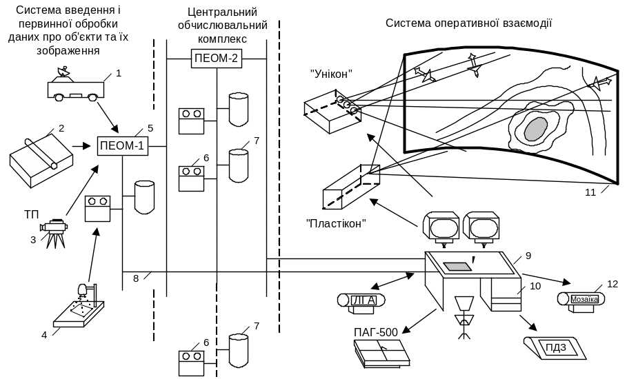 Система оперативної взаємодії містить засоби відображення символів, які рухаються на кольоровому картографічному фоні, як на звичайних моніторах – 9, так і на екрані колективного користування – 11, а також засоби, що дозволяють забезпечити введення-виведення зображень: редакційно-видавнича система на базі лазерного гравіювального автомата ЛГА, необхідного для створення твердих копій динамічних сцен, 12 – Мозаїка – пристрій друку кольорових зображень великих форматів і роздільної здатності, графічний пристрій – ПАГ-500, необхідний для викреслювання точних зображень, які містять картографічний матеріал та координатну сітку, пристрій друку знакосинтезуючий – ПДЗ. За допомогою системи оперативної взаємодії оператор чи група операторів-фахівців здійснюють взаємодії, що забезпечують роботу комплексу в інтерактивному режимі (10 – пристрій видачі мовних сигналів). Як система генерації кольорової статичної і динамічної інформації та її відображення на екрані колективного користування застосовується система «Унікон», яка призначена для підтримки інтерактивної взаємодії оператора з комплексом та для відображення в реальному часі повітряної обстановки, дані про яку видаються з імітатора, зібраного на базі касетного модуля зовнішньої пам'яті. В свою чергу, система «Пластікон» здійснює відображення картографічної інформації.
