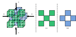 Необходимо заполнить весь расчётный объем элементарными расчётными ячейками в шахматном порядке, как по горизонтали, так и по вертикали. Все расчётные элементы кроме крайних будут иметь общие ребра с соседними расчетными элементами. Все стороны будут уникальными. На рисунке 3 схематично показано расположение элементарных расчётных ячеек в расчетном объеме.