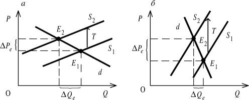 Пересечение кривых спроса (d) и предложения (S1) определяет рыночное равновесие (E1) с ценой Pe1 и объемом Qe1. Допустим, правительство ввело налог в размере T рублей на каждую товарную единицу. Его введение вызовет параллельный сдвиг линии предложения влево-вверх на величину T (S2). Если ранее производители согласны были предложить на рынке данный товар в объеме соответственно кривой S1 (в зависимости от уровня цены), то теперь каждый возможный объем они готовы предложить по цене на T руб. больше, чем раньше. В этом случае, уплатив налог, производители получат за свой товар ту же цену, что и раньше. В результате линия предложения займет положение S2. Прежний равновесный объем Qe1 производители захотят продать по цене P2 (P2 = Pe1+T). Hо при данной цене спрос (Qd2) значительно меньше прежнего (Qe1). Возникнет затоваривание, следствием которого станет тенденция к снижению цены на единицу товара и сокращение выпуска. Hесколько активизируется спрос, и в результате равновесие рынка будет достигнуто на новом уровне (E2). Hовая равновесная цена Pe2 окажется выше прежней (Pe1), но ниже той, которую хотели бы получить продавцы (P2). Меньшим будет и новый равновесный объем (Qe2 < Qe1).