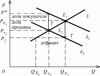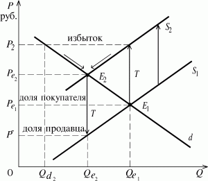 Итогом прихода рынка данного товара в новое равновесное состояние станет фактическое распределение потоварного налога между продавцом и покупателем при том, что формально налог вносит в бюджет продавец (производитель). Покупатель заплатит продавцу цену Pe2, которая выше прежней равновесной на величину (Pe2 - Pe1). Это «доля» покупателя в потоварном налоге. Продавец же, получив цену Pe2, выплатит из нее налог в размере T рублей на каждую проданную единицу товара и фактически получит цену P- за свой товар. Его «доля» в потоварном налоге составит величину (Pe1 - P-).