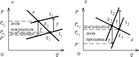 В первом случае (левый график) спрос и предложение достаточно эластичны к изменению цены. Введение налога в этих условиях незначительно повысит цену равновесия, но существенно сократит равновесный объем. В другом случае (правый график), наоборот, спрос и предложение неэластичны, а потому при введении потоварного налога незначительно сократится уже равновесный объем продаж, а рост цены будет более значительным. Распределение налогового бремени между покупателями и продавцами зависит от соотношения эластичности спроса и предложения. Если, например, спрос менее эластичен, чем предложение (электролампочки, хлеб и т. п.), то основную тяжесть налога будут нести покупатели (рис. 4а). Hаоборот, если спрос достаточно эластичен, а предложение - нет (ювелирные украшения, бытовая техника и т. п.), то налоговое бремя в большей степени ляжет на производителей (рис. 4б).