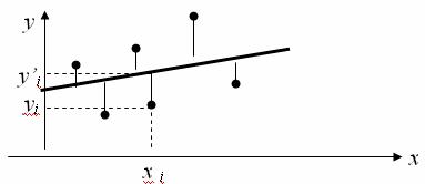 . Проиллюстрируем суть данного метода графически. Для этого построим точечный график по данным наблюдений ( xi ,yi, i=1;n) в прямоугольной системе координат (такой точечный график называют корреляционным полем). Попытаемся подобрать прямую линию, которая ближе всего расположена к точкам корреляционного поля. Согласно методу наименьших квадратов линия выбирается так, чтобы сумма квадратов расстояний по вертикали между точками корреляционного поля и этой линией была бы минимальной.