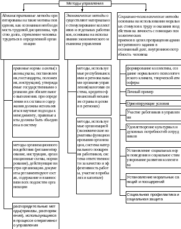 Все методы управления независимо от их классификации органически взаимосвязаны, находятся в постоянном динамическом равновесии и воздействуют одновременно на весь коллектив и отдельно на каждого человека, занимающихся различными видами трудовой деятельности. Характеризуя методы управления, необходимо раскрыть их направленность, содержание и организационную форму.