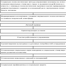 Социально-психологическое воздействие на персонал осуществляется с помощью социальных и психологических методов. Социально-психологические методы представляют собой совокупность специфических способов воздействия на личностные отношения и связи, возникающие в трудовых коллективах, а также на социальные процессы, протекающие в них. Они основаны на использовании моральных стимулов к труду, воздействуют на личность с помощью психологических приемов в целях превращения административного задания в осознанный долг (рис.15).