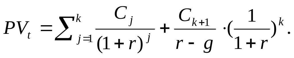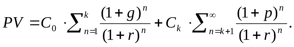 Пусть продолжительность фазы непостоянного роста составляет k лет, дивиденды в этот период по годам равны Cj (j=1,2,…, k), Сk+1 – первый ожидаемый дивиденд фазы постоянного роста с темпом g. Тогда формула примет вид: