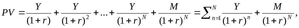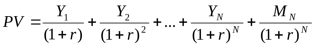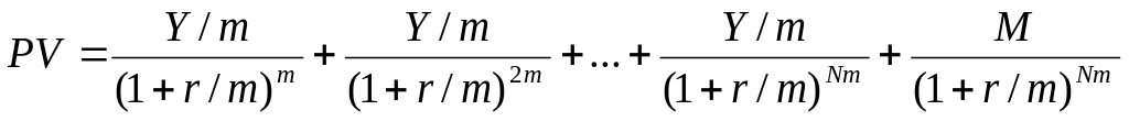 где PV — текущая стоимость облигаций, ден. ед., Y — годовые процентные выплаты, определяющиеся номинальным процентным доходом (купонной ставкой), r — требуемая норма доходности, %, М - номинальная стоимость облигации (сумма, выплачиваемая при погашении облигации), ден. ед., n — число лет до момента погашения.