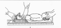 Рис. 2-1. Измерение длины тела на горизонтальном (а) и вертикальном (б) ростомерах.