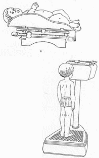 до момента падения штанги вниз, регулируя гирей, определяющей граммы до положения установления равновесия. Если ребёнок умеет сидеть, его можно посадить на широкую часть весов, поместив ножки на узкой. По окончании взвешивания закрыть затвор, снять ребёнка с весов, записать результат, убрать пелёнку с весов, протереть рабочую поверхность весов дезинфицирующий раствором, снять перчатки, вымыть руки. При определении массы тела ребёнка из показаний весов необходимо вычесть массу пелёнки. Измерение массы тела детей Злет и старше проводят утром натощак на специальных медицинских весах с точностью до 50 г, соблюдая те же правила, что и при проведении взвешивания детей раннего возраста (рис. 2-2 а, б).