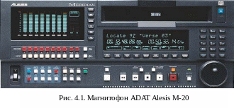 На рис. 4.1 показан образец магнитофона формата ADAT - Alesis M-20. Магнитофон обеспечивает запись 8 звуковых каналов с разрешением 16 или 20 бит на частотах дискретизации 44,1 кГц/48 кГц. Имеет функции чтения и генерации временного кода по стандарту SMPTE/EBU. Предусмотрена вспомогательная (девятая) аналоговая дорожка с отдельными аналоговыми XLR-входом и XLR-выходом. Также предусмотрена плата с четырьмя парами декодеров и четырьмя парами кодеров интерфейса формата AES/EBU для приема и передачи звуковых сигналов в цифровой форме [96].