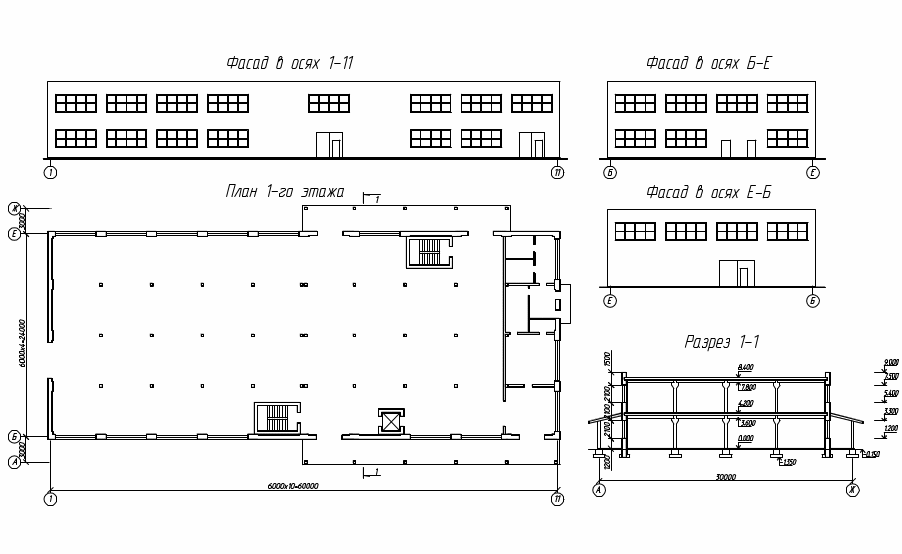 Рисунок 2.1 I вариант – план, разрез, фасады.