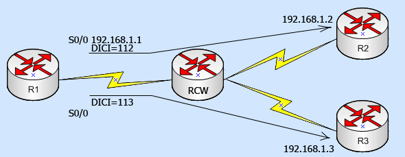 На рисунке у маршрутизатора R1 настроить два подинтерфейса в режиме multipoint с двумя РVС. Все маршрутизаторы должны находиться в подсети 192.168.1.0/24. РVС с номером DLСI 112 используется для соединения с маршрутизатором R2, РVС с номером DLСI 113 используется для соединения с маршрутизатором R3. Split-horizon по умолчанию выключен на физических интерфейсах Frame Relay “точка-много точек” и включен на подинтерфейсах Frame Relay “точка-много точек”. На рисунке используется подинтерфейс “точка-много точек”, то есть split-horizon должен быть отключен вручную на маршрутизаторе R1 чтобы решить проблему достижимости.