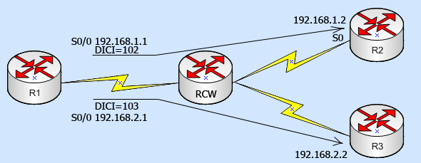 На рисунке у маршрутизатора R1 настроить два подинтерфейса точка-точка. Подинтерфейс S0.102 должен соединяется с маршрутизатором R2, а подинтерфейс S0.103 должен соединяется с маршрутизатором R3. Каждый подинтерфейс должен находиться в отдельной подсети.